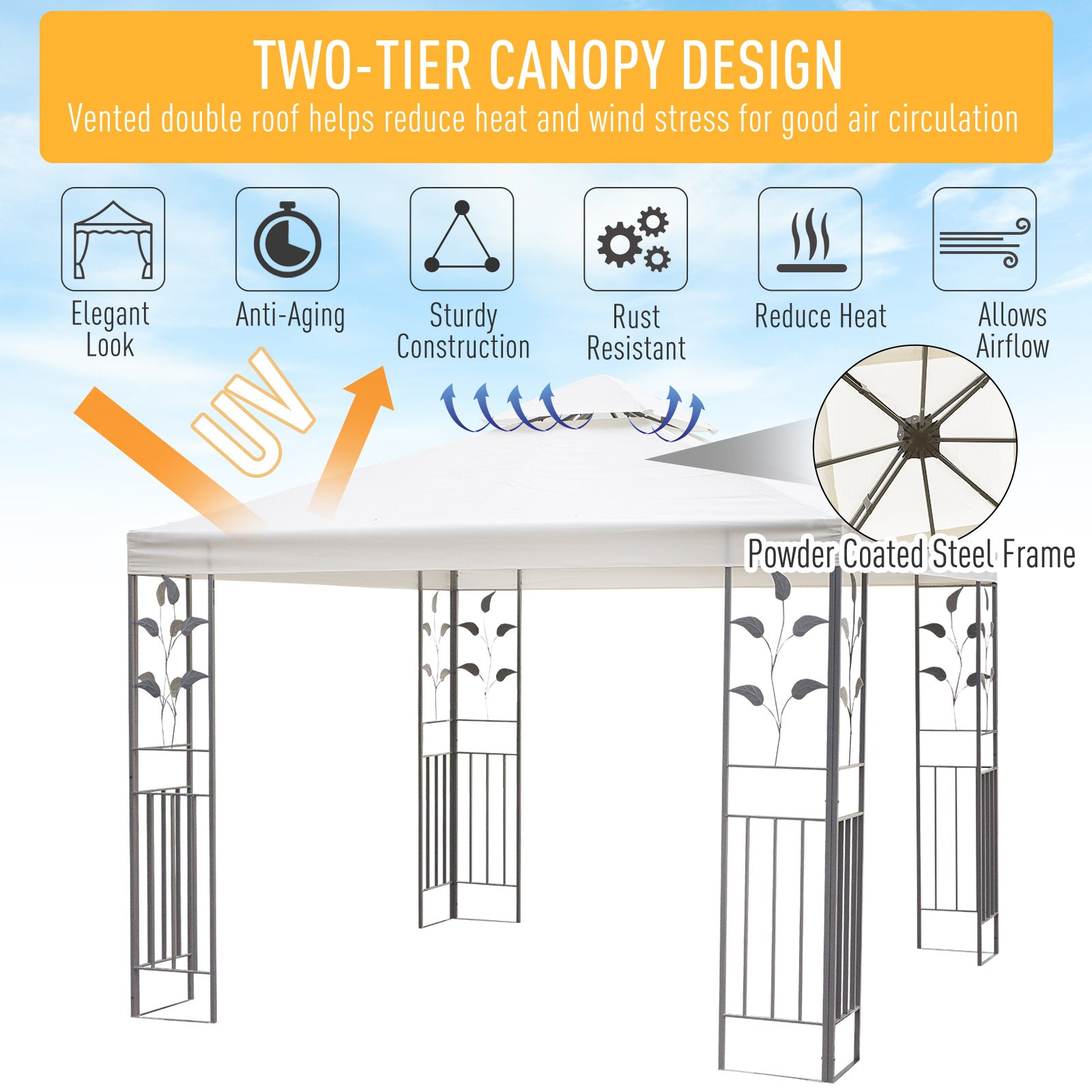 Add an elegant touch to any outdoor space with the Homivas 9.8' x 9.8' backyard gazebo, the perfect sun shelter for any occasion! With a clean-looking cream white colored top complementing the beautiful black frame, this classic and classy color scheme will fit with any location. Decorative frame supports in an ornate style make the deck canopy an ideal choice for adding class to any outdoor setting.