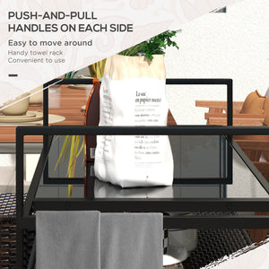 Take your entertaining to the next level with an outdoor bar cart by Homivas. It has a tempered glass table, second layer and a cabinet on the bottom, giving you room to cart in entrees, drinks, and ordures. Lift the handle and roll it around; it's easy to go from the kitchen to your outdoor dining space, and the included brakes lock it in place. Use a handle as a towel rack and keep cleaning supplies in the cabinet. It endures spills and outdoor conditions. Get on a roll with Homivas.