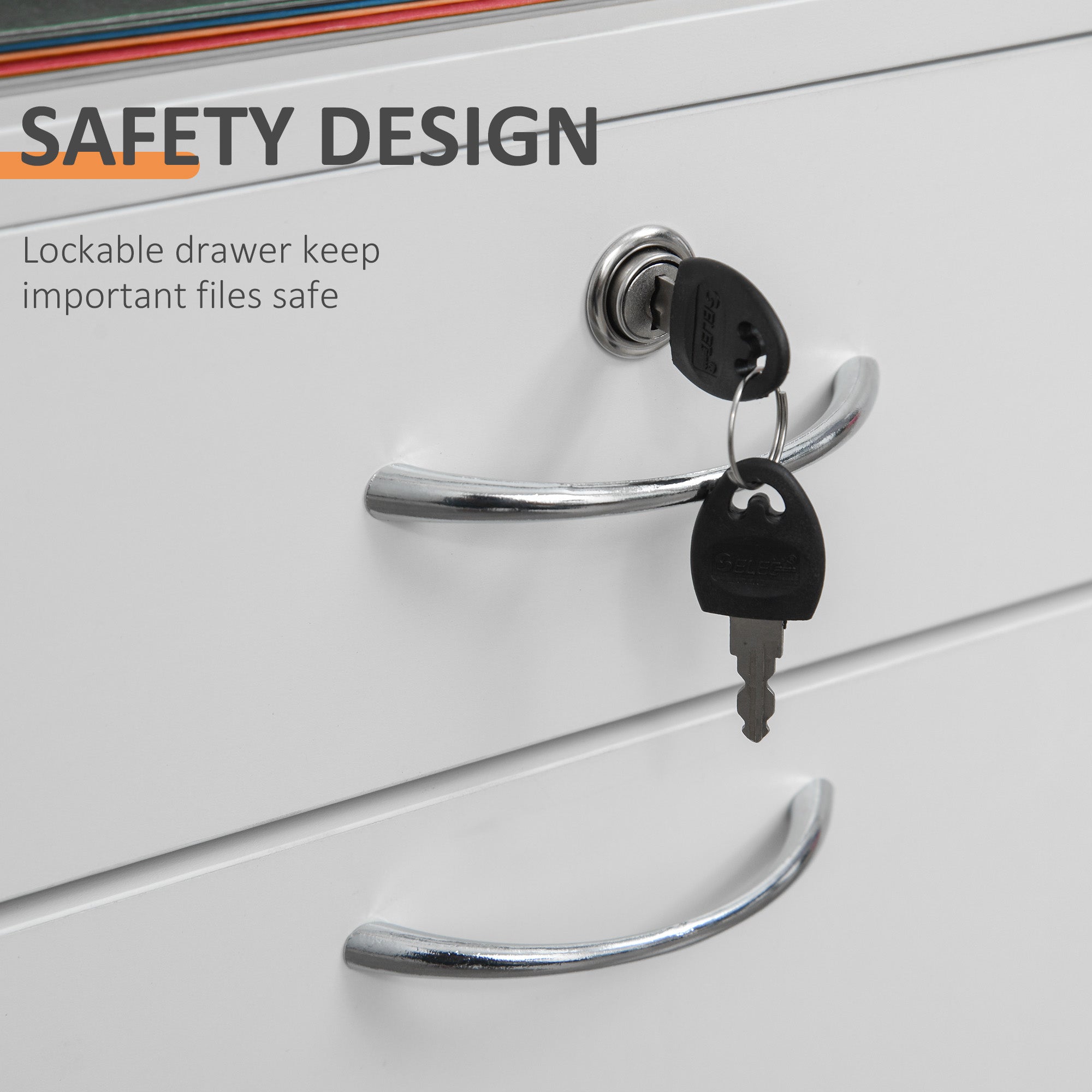 - • Lockable drawer with two keys keeps important files safe