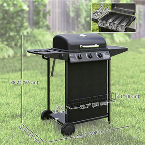 3+1 Burner Propane Gas BBQ Grill, Portable Gas Barbecue Grill with Side Burner, Thermometer, Lid, Side Table, Shelf, Spice Rack, Wheels, Grease Cup for Garden, Black