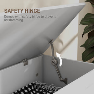 Discover the charm and functionality of the Homivas Storage Bench! This versatile piece offers ample inner space to declutter your home, doubling as a comfy seat with a 300lbs capacity. Safety hinges keep fingers safe, making it a great storage box or end-of-bed trunk. Its modern wood grain finish adds a sleek touch to any room.