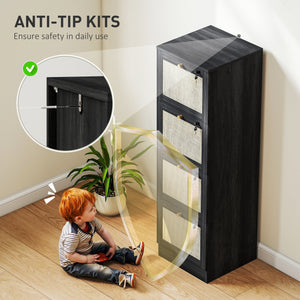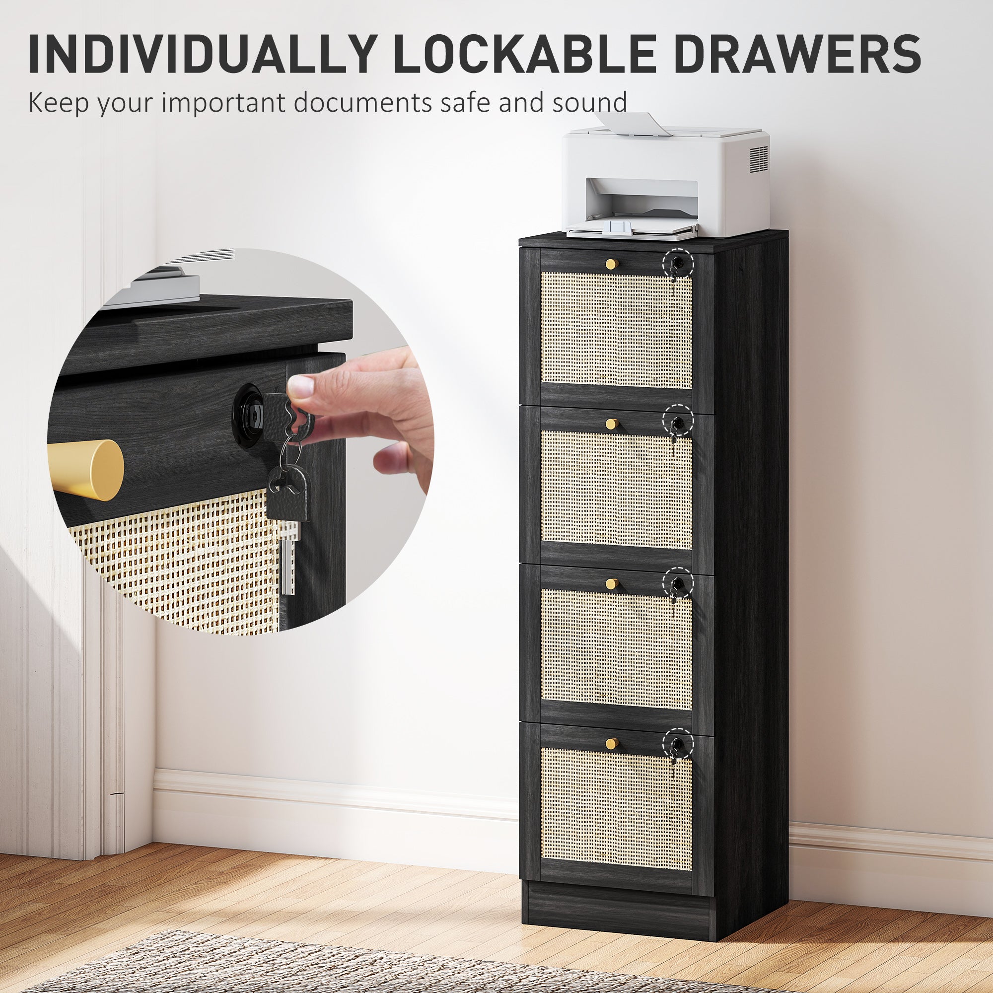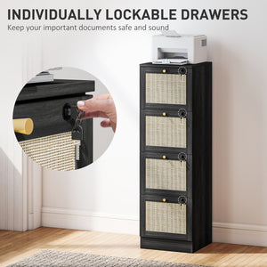 4 Drawer Filing Cabinet with Lock, Boho File Cabinet for A4 Letter Size Files with Decorative Rattan Accents, Black