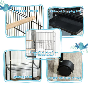 49" Rolling Bird Cage Cockatoo House Play Top Finch Pet Supply with Storage Shelf, Wheels - Black