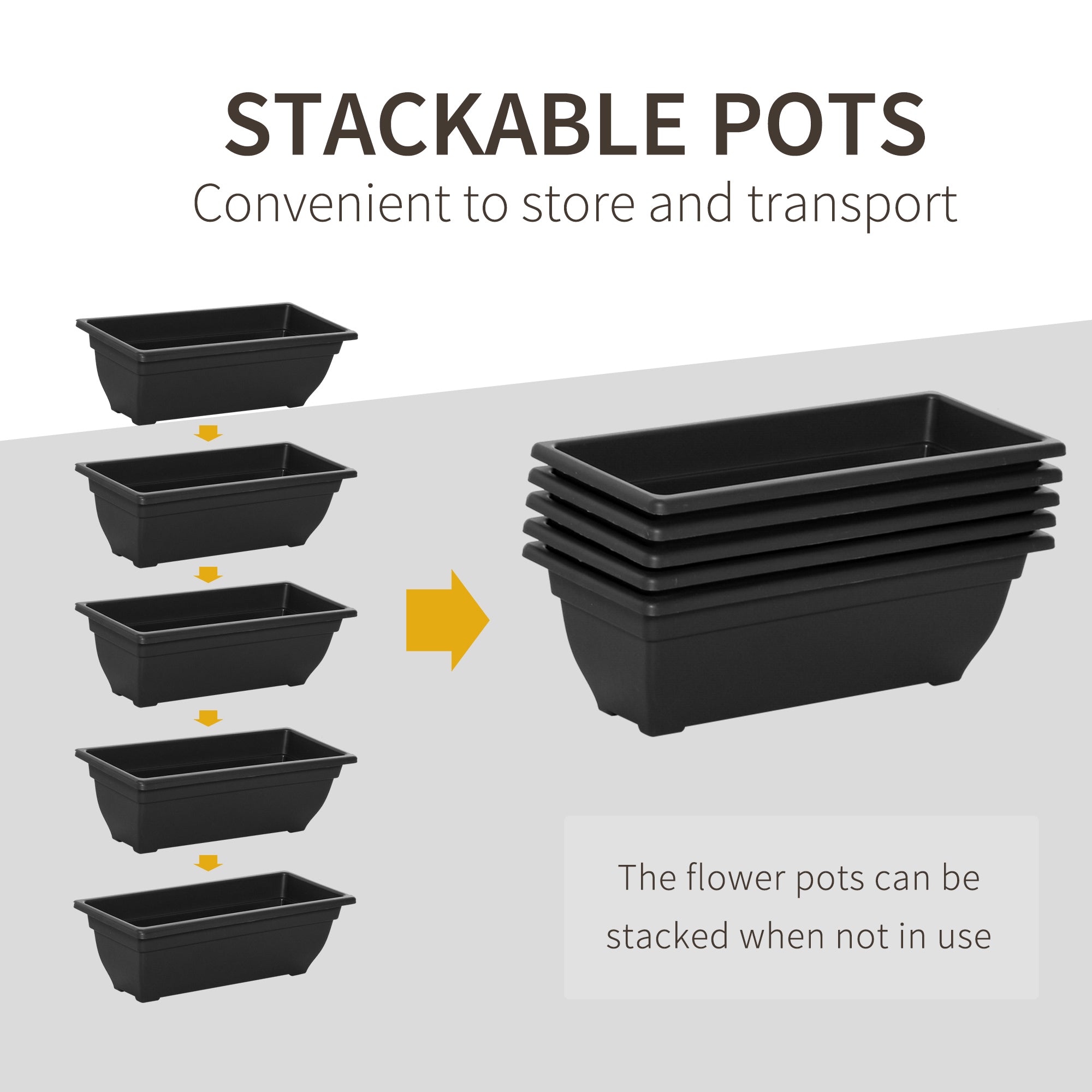 - • The pots are stackable, conserving space for storage and transport