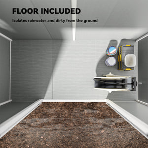 Discover the spacious Homivas Shed, your new haven for outdoor organization! Crafted from robust 12mm thick polypropylene resin and reinforced with aluminum, this waterproof, UV-resistant resin shed keeps your tools secure and dry. The included floor shields against rain, while a sunlit window and dual vents maintain freshness. Great as a outdoor garden tool shed!