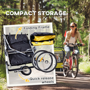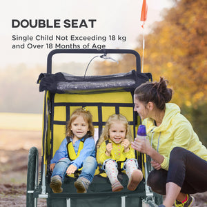 Aosom 2-in-1 Bike Trailer for Kids, Foldable 2-Seat Baby Stroller with 5-Point Harness, Rubber Wheels, Storage Bag, Yellow