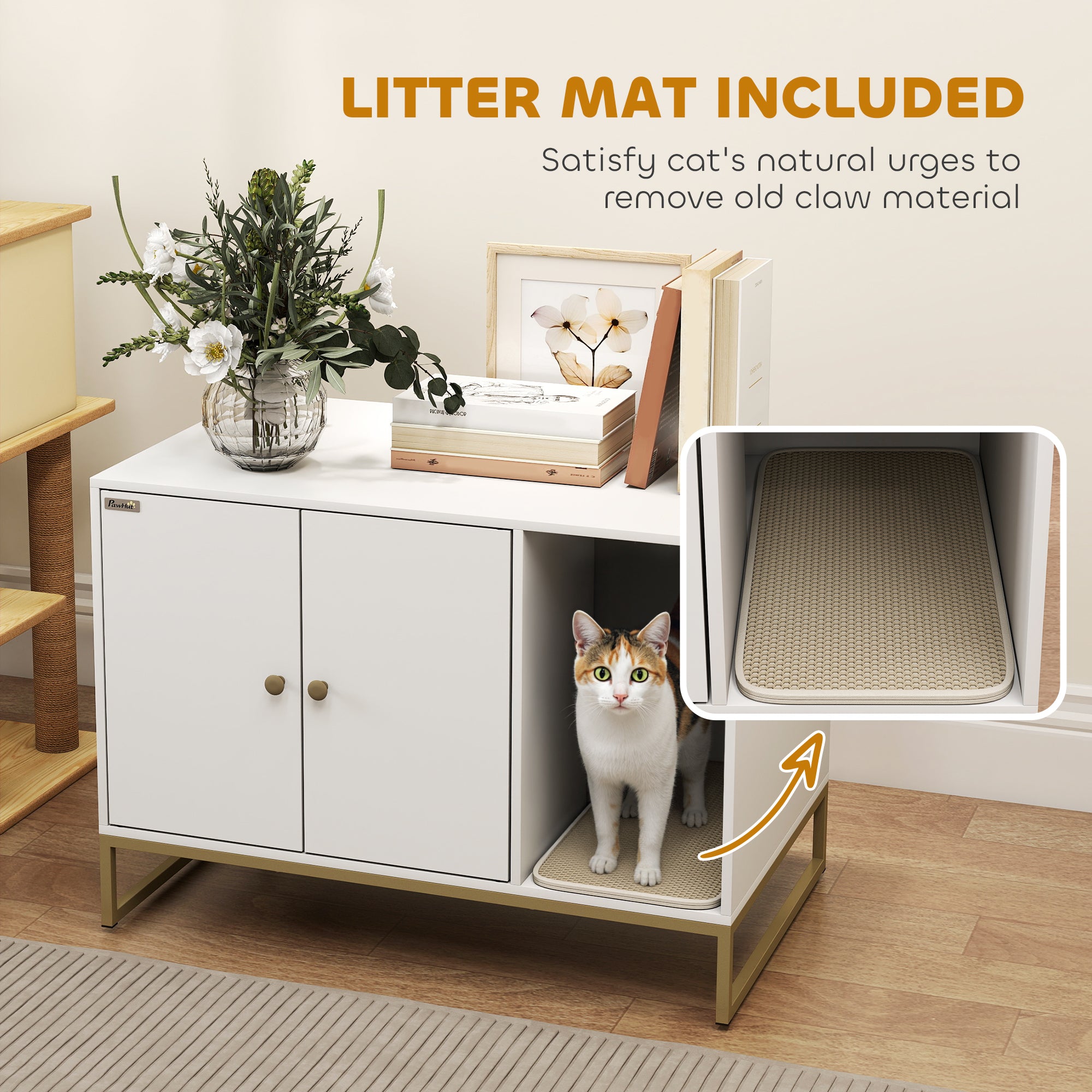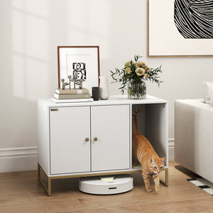 - • Stylishly hides the litter box, functioning as an elegant side table
