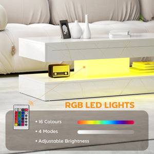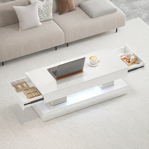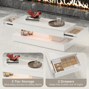 Coffee Table with Adjustable LED Lights, Center Table with 2 Drawers, Open Shelf, Remote, High Gloss Marble-Effect White