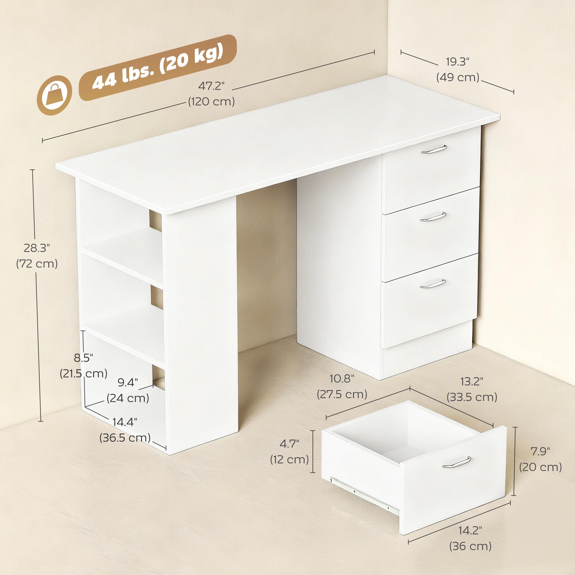 Computer Desk, 47" Writing Table with 3-Tier Shelves and 3 Reversible Drawers for Home Office, Bedroom, White