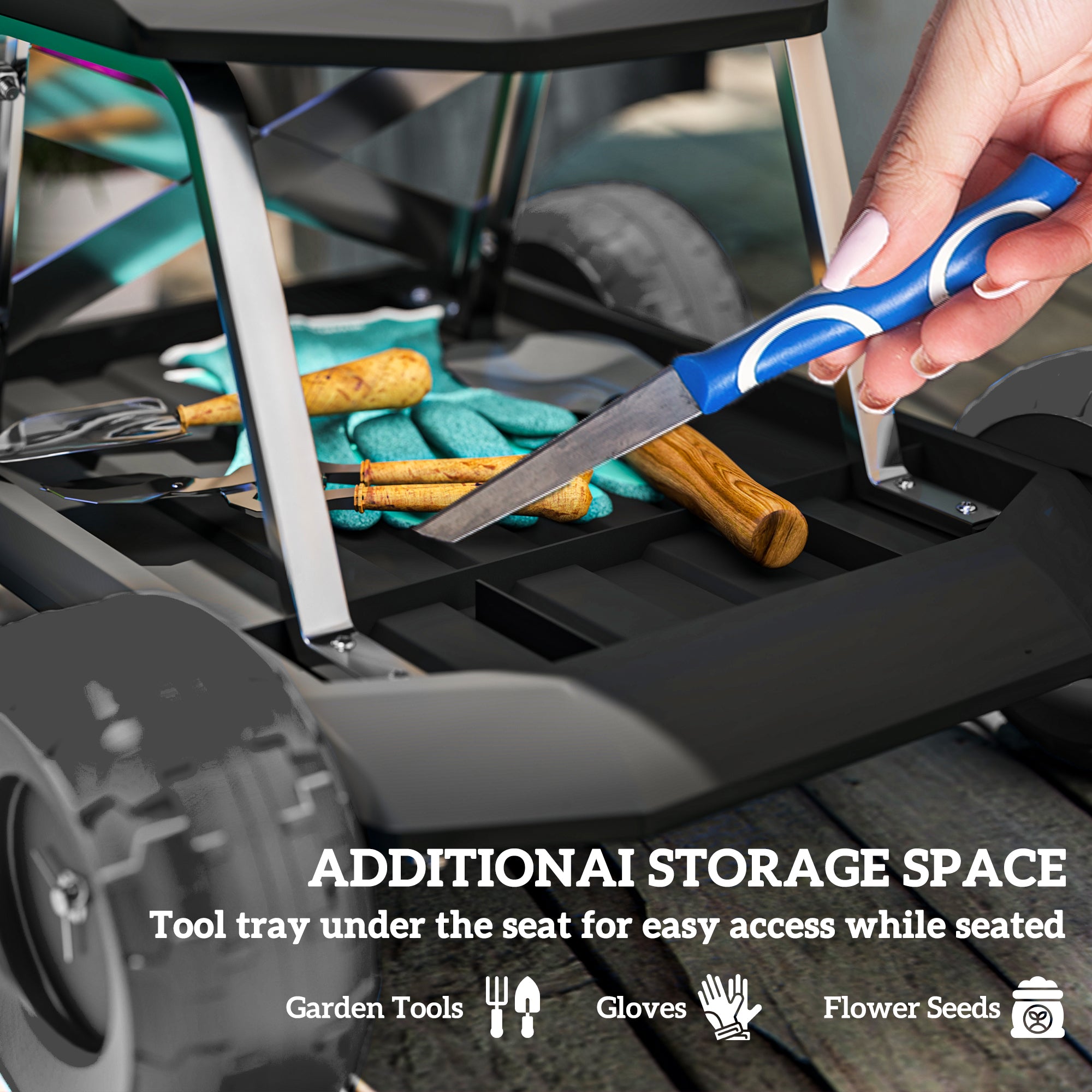 Garden Seat with Wheels, Rolling Garden Stool with Tool Tray, Cart for Outdoor Work, 19.7" x 19.3" x 12.6", Black