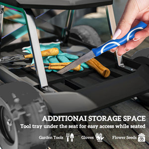 The Homivas garden scooter with work seat is the great solution for comfortable and practical gardening or workshop tasks. Its innovative design provides an ergonomic seat that relieves pressure on your knees and back, allowing you to work longer without discomfort. Plus, the integrated tool tray beneath the seat keeps your tools easily accessible while you stay seated.