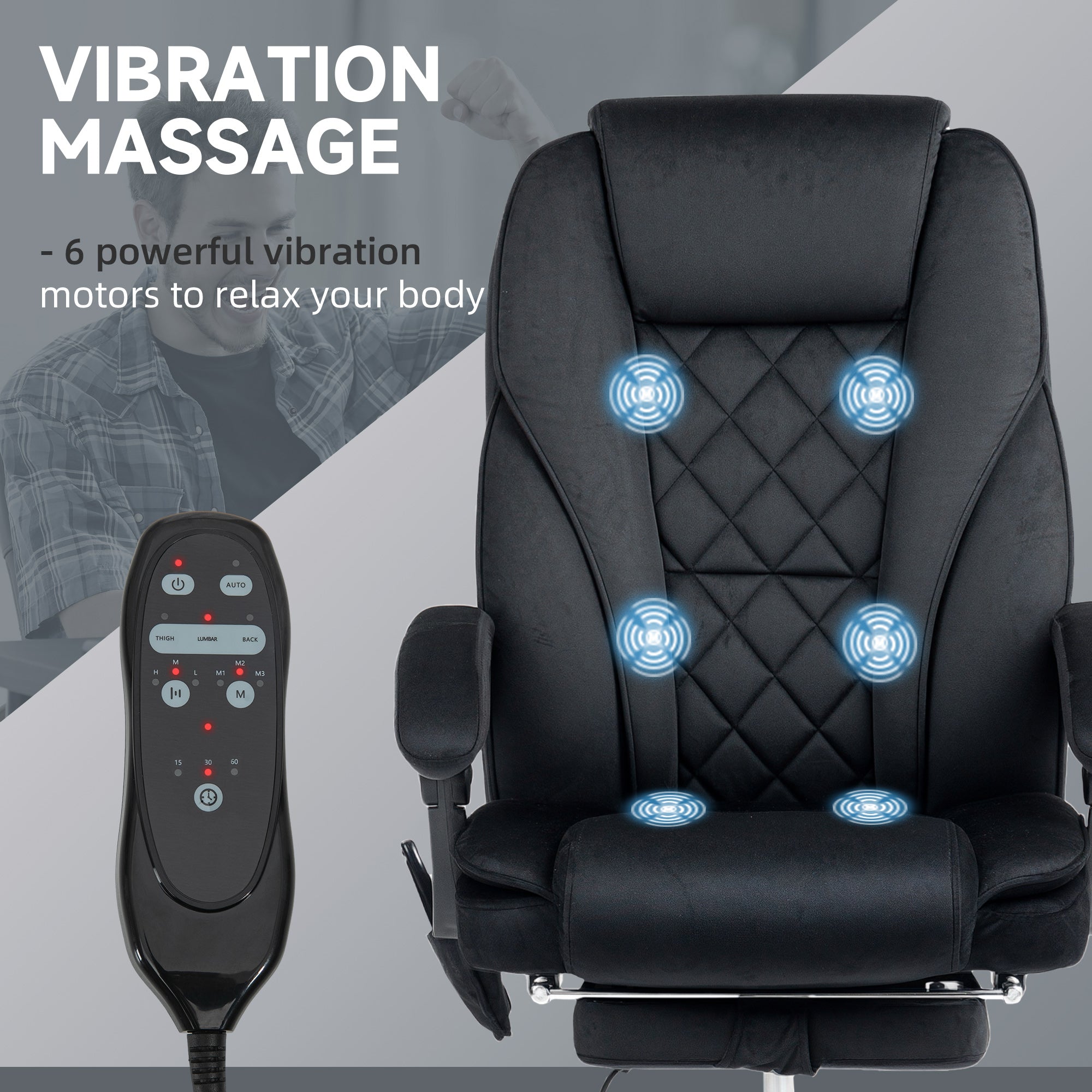 - • Six vibration massage points with three modes, three intensities, and a timer to relax your body