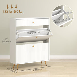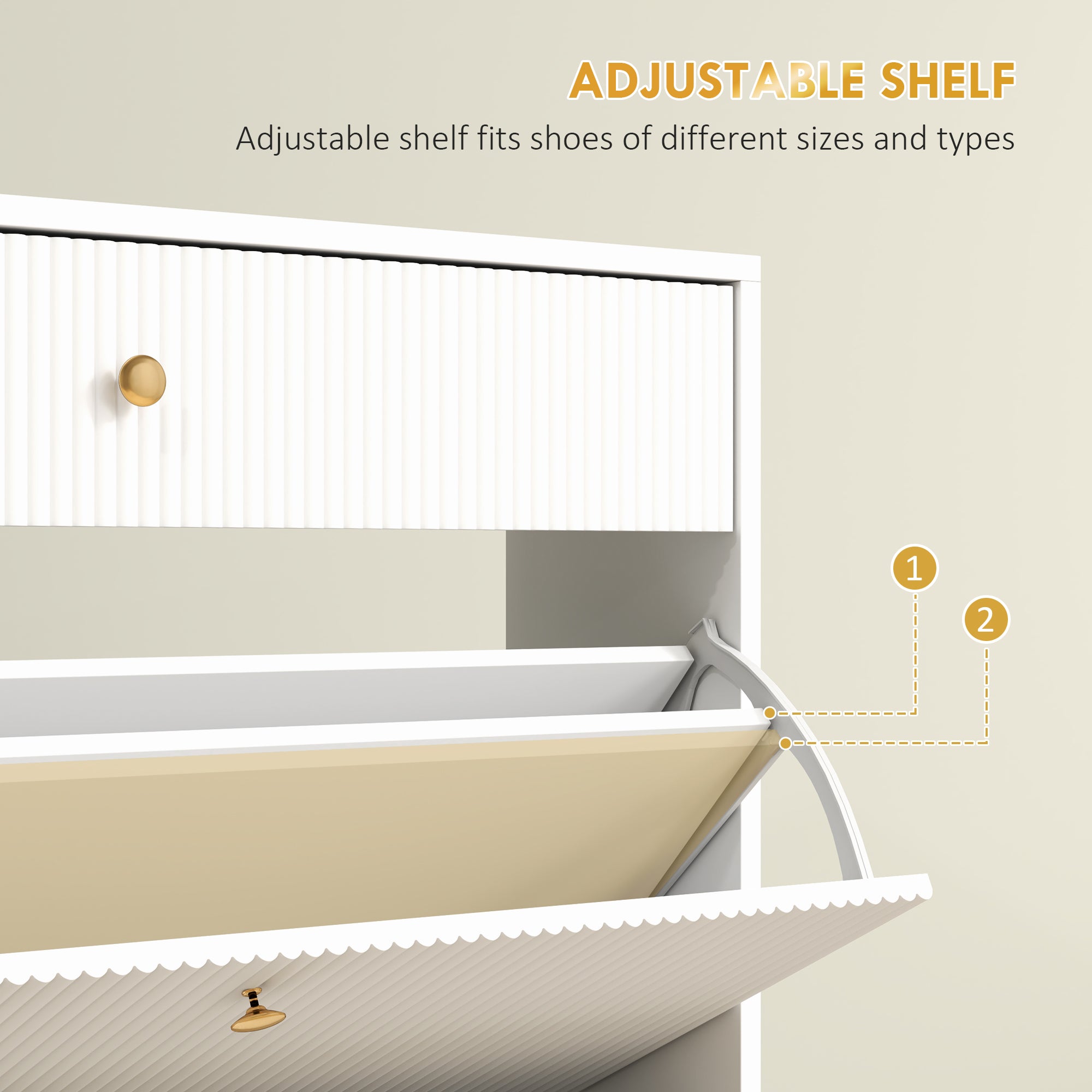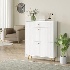 Transform your entryway with the stylish Homivas entryway cabinet! This slim shoe cabinet features solid colour finishes and wave-like fluted panels with chic gold handles, adding a modern touch to your space. Its two flip drawers neatly store up to 12 pairs of shoes, while a small drawer keeps essentials at hand, making it a great shoe rack cabinet for any home.