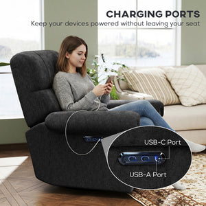 Power Recliner Chair, Fabric Upholstered Recliner Chair with USB Ports, Swivel and Rocking Function, Footrest, Black