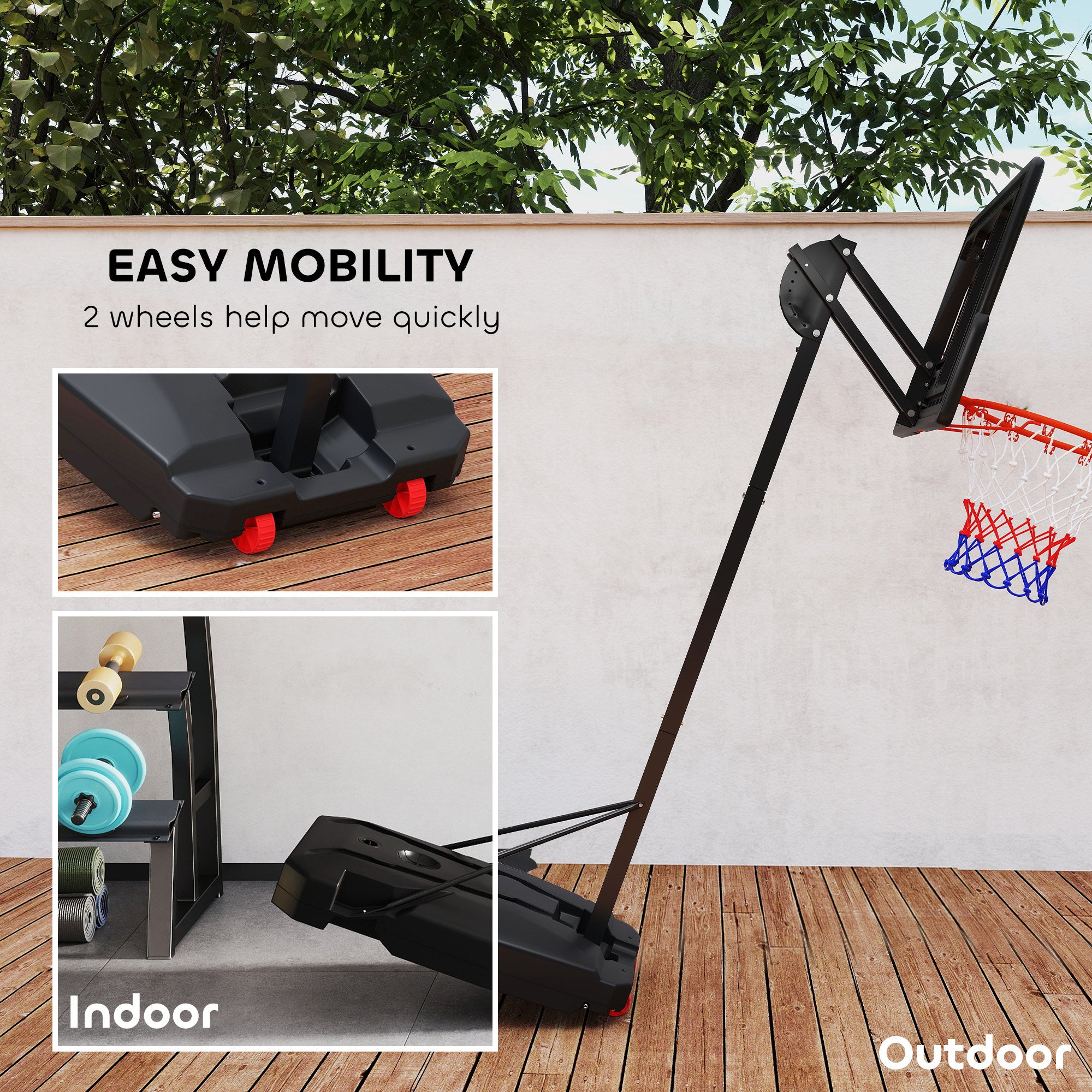 Elevate your game with the Qaba basketball hoop! Adjustable from 6.6'-8.5' (200-260cm), it grows with your child from age 6 into their teens. The large, stable base can be weighted with up to 154 lbs. (70kg) of sand and water for firm support, plus it's easy to move with built-in wheels. Suitable for any aspiring player, from toddler basketball hoop enthusiasts to seasoned kids basketball net shooters.