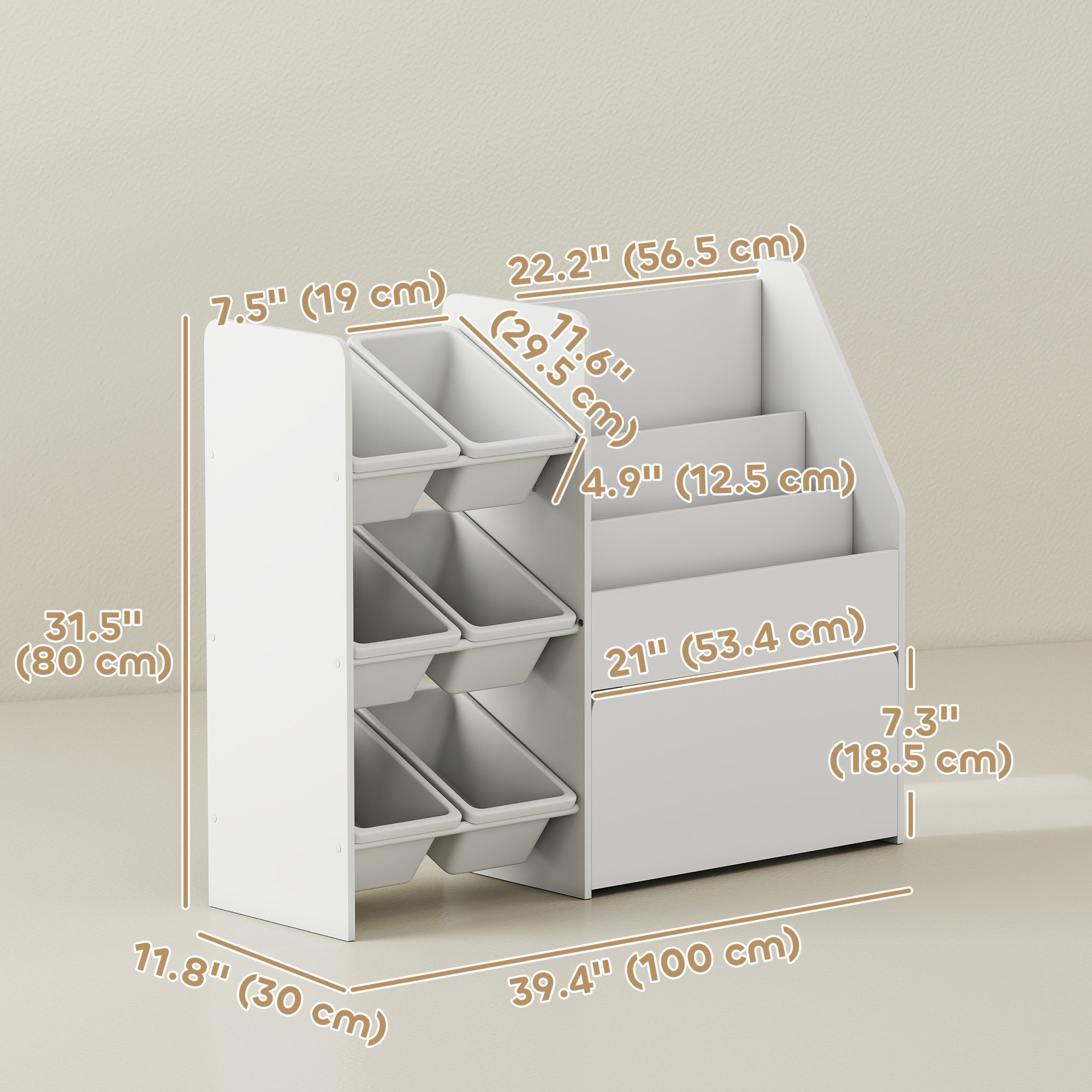 - • Right Bookshelf (each): 22.2" W x 3.1" D x 4.6" H (56.5 x 8 x 11.7 cm)