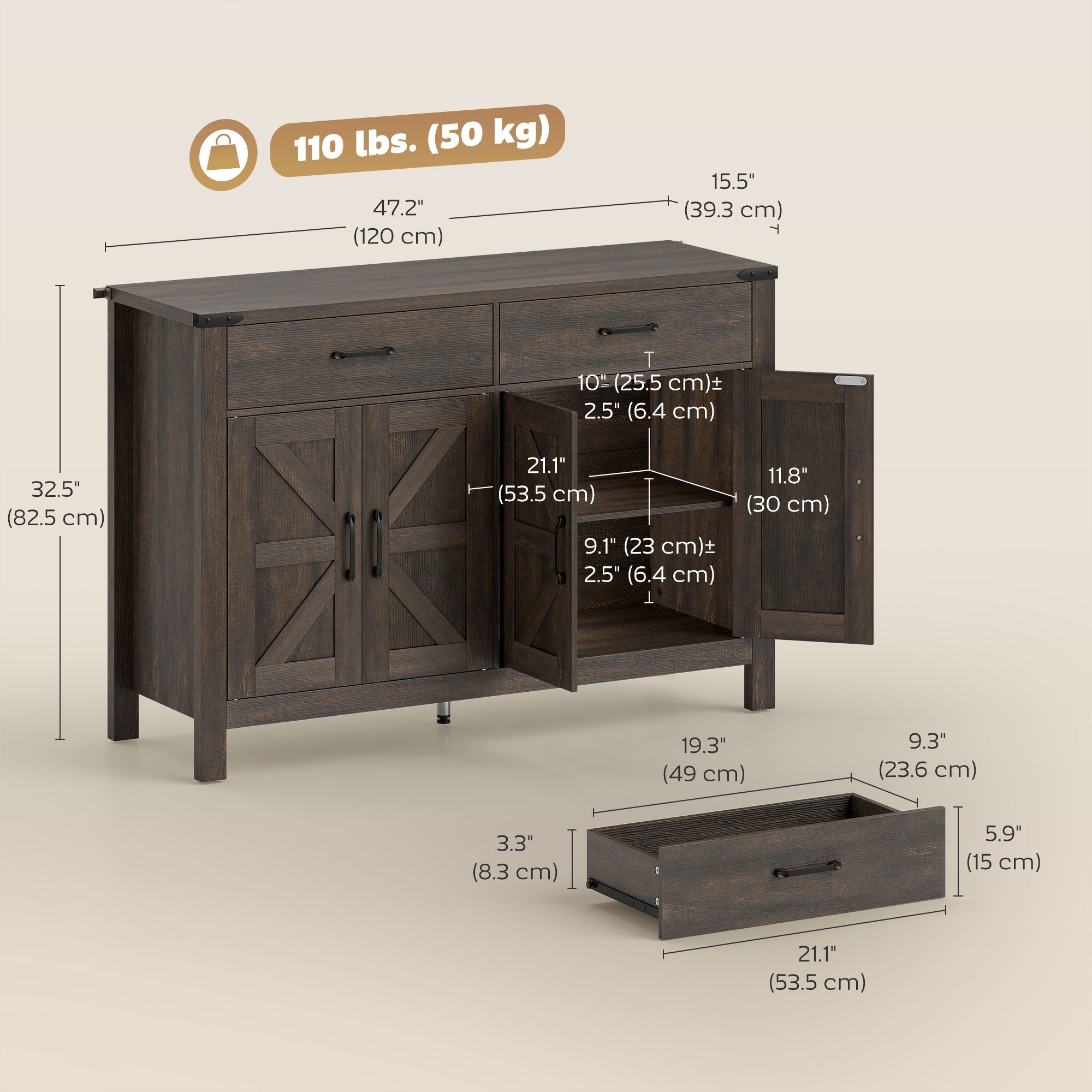Transform your room with this Homivas enchanting farmhouse-style sideboard buffet cabinet, boasting stylish wood grain, barn doors, and sleek metal accents. Great as a coffee bar or chic sideboard, it offers ample storage with two large drawers and two spacious cabinets. Its adjustable shelves cater to various item sizes, ensuring everything stays tidy and dust-free. A lovely blend of charm and practicality!