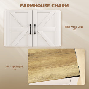 - • Wood grain finish, barn doors, and metal accents add rustic farmhouse charm