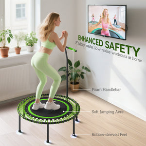 Jump into fun and fitness with the Soozier rebounder trampoline for adults. Designed for full-body workouts at home, this fitness trampoline features 36 bungee cords for a quiet, joint-friendly bounce and a heavy-duty steel frame that supports up to 450 lbs. The height-adjustable T-shaped handle adds stability for every jump, while non-slip feet protect your floors. Great for cardio, balance, and strength training - all in one compact, family-friendly design.