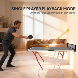 Unfold the fun with the Soozier ping pong table, ingeniously designed to fold into quarters for ultra-compact storage. With adjustable foot pads for a level playing field, this table tennis table supports up to 110 lbs (50 kg). Remove the net, and voilà—a stylish dining or game table for all your entertainment needs!