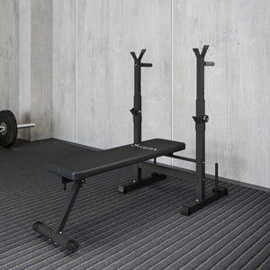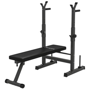 This Soozier weight bench with squat rack is ideal for any level of user looking to build, ton, and maintain muscle mass. We feature a barbell rack, weight lifting bench and dip station, a great option to work out your entire body right at home. The steel tube construction makes the strength training bench sturdy and stable, while the standard plate weight racks allow you to keep the weight close at hand. Try this squat and bench rack by Soozier and start getting the body of your dreams.