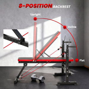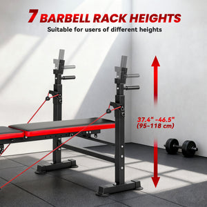 - • Multifunctional weight bench with integrated barbell rack for full-body training