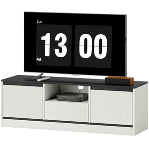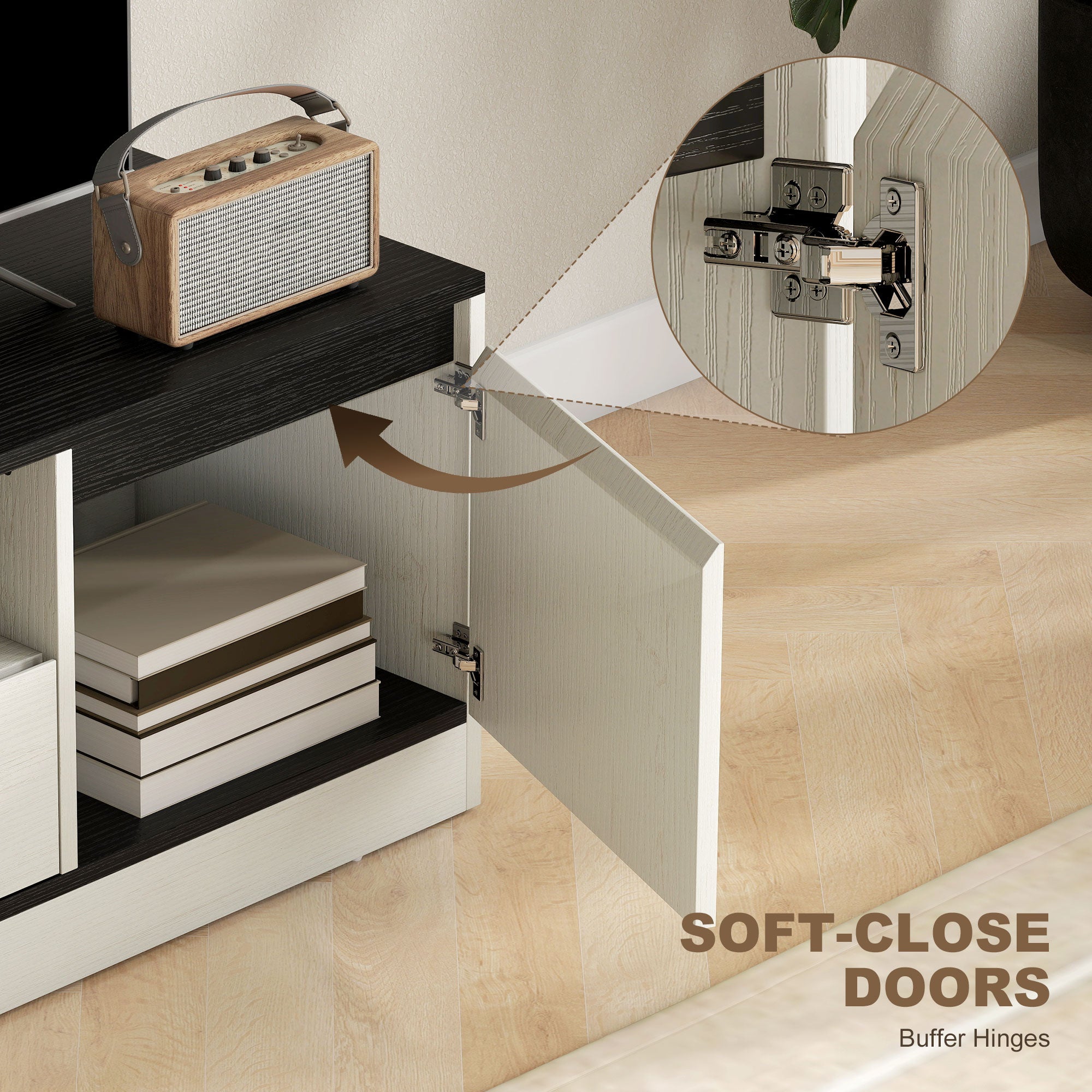 Elevate your lounge with our Homivas chic TV stand, blending a sleek black wood grain with white finish. Tuck away clutter with ease using the spacious cabinets, a handy drawer, and an open shelf. Enjoy the peace with soft-close doors that shut silently, keeping your living space serene and stylish. This TV console is great for organising and enhancing any entertainment area!