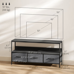 TV Stand with Charging Station, TV Table with 3 Foldable Linen Drawers and Open Shelf for 55 Inch Television, Black