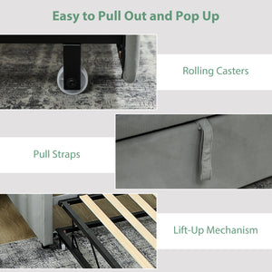 Upholstered Twin Size Trundle Bed, Velvet Twin to King Day Bed with Pop Up Trundle, Headboard and 2 Pockets, Light Grey