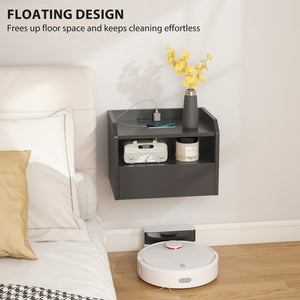 Wall Mounted Bedside Table, Set of 2 Floating Nightstand with Charging Station, Drawer and Open Shelf for Bedroom, Black
